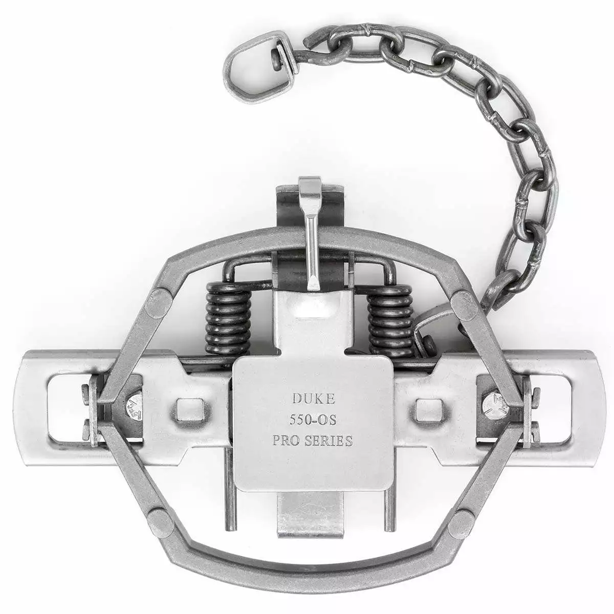 The Duke 550-OS Pro model with its 14cm features heavy cast steel jaws, a heavy duty #2 machine link chain that has a D-ring, a center swivel and 2 coil springs. The jaw spread is great for catching foxes and small animals. Traps are used for predator control and wildlife management. A quick, humane kill achieved when used properly and this trap should not be used where they might trap other animals.