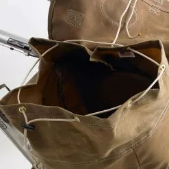 - Materials: 510g waxed canvas, premium leather, 2 plastic stiffener plates, solid brass hardware