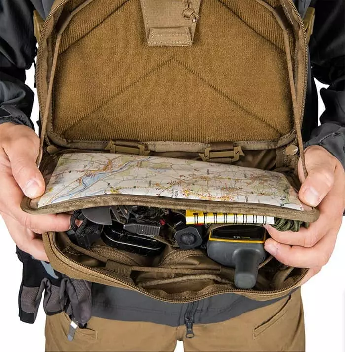Additionally, one of the internal walls is covered with soft velour compatible with VIS inserts. Internal, detachable organizer with transparent map pocket makes it easy to navigate. Limiters made of durable cord provide up to 90 degrees opening angle. Design of the minimalistic, yet comfortable harness will not interfere with any type of backpack shoulder straps. External mounting points, compatible with MOLLE/PALS give you possibility to expand the chest pack according to your needs.