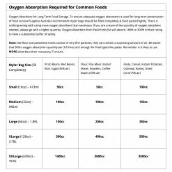 | Oxygen Absorbers for Long Term Food Storage. To ensure adequate oxygen absorption for long term preservation of food Survival Supplies Australia recommends mylar bags should be filled completely & food packed tightly. There is nothing wrong with using more oxygen absorbers than necessary. If you are unsure of the quantity of oxygen absorbers needed, always go with a higher quantity. Oxygen Absorbers from PackFreshUSA will absorb 180% to 300% of their rating to have a substantial buffer of safety. Note: like flour and powdered mixes consist of very fine particles, they can contain a surprising amount of air. Be aware that 300cc oxygen absorption quantity per 3.8 litres isn’t enough for food types like pasta. | |||